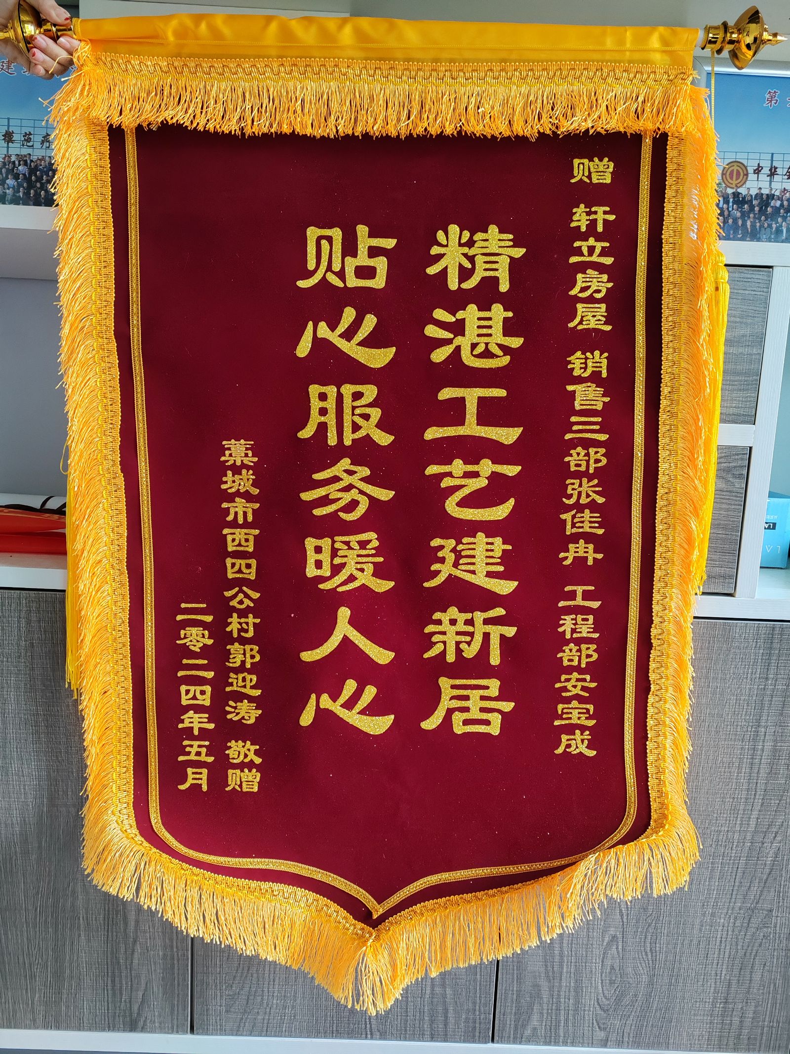 今天,我們收到了一面來自石家莊市藁城區(qū)業(yè)主郭先生送來的錦旗,上面寫著“精湛工藝建新居,貼心服務暖人心”。這面錦旗不僅是業(yè)主對軒立房屋精湛工藝和卓越服務的肯定,更是對軒立所有工作人員辛勤付出和專業(yè)技能的認可。