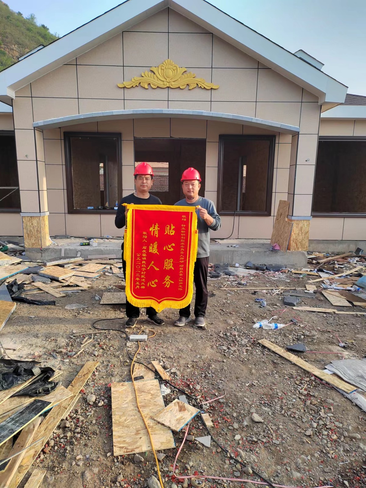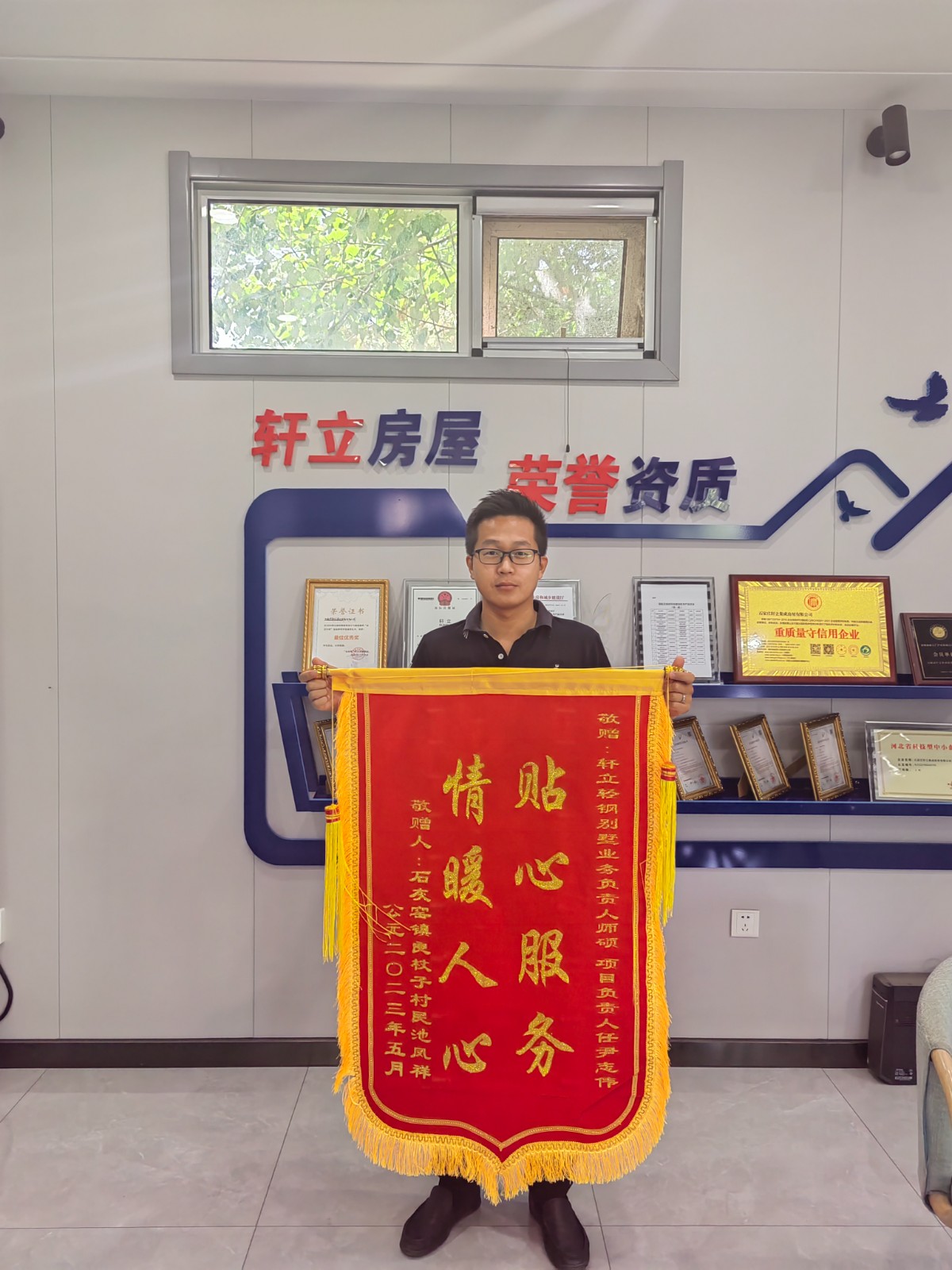 5月23號軒立業(yè)務(wù)經(jīng)理師碩及項(xiàng)目經(jīng)理尹志偉收到了來自承德市承德縣石灰窯鎮(zhèn)良杖子村業(yè)主池風(fēng)祥先生送來的致謝錦旗,業(yè)主家為一層117.1平方米的四室兩廳一衛(wèi)輕鋼別墅,目前主體已經(jīng)完工,窗戶及入戶門還未安裝,雖未見完工后的效果,業(yè)主池先生就已經(jīng)把錦旗送到項(xiàng)目部,由項(xiàng)目經(jīng)理將錦旗送回公司,池先生對項(xiàng)目經(jīng)理尹志偉的專業(yè)及業(yè)務(wù)經(jīng)理師碩的負(fù)責(zé)進(jìn)行了高度的贊揚(yáng)。